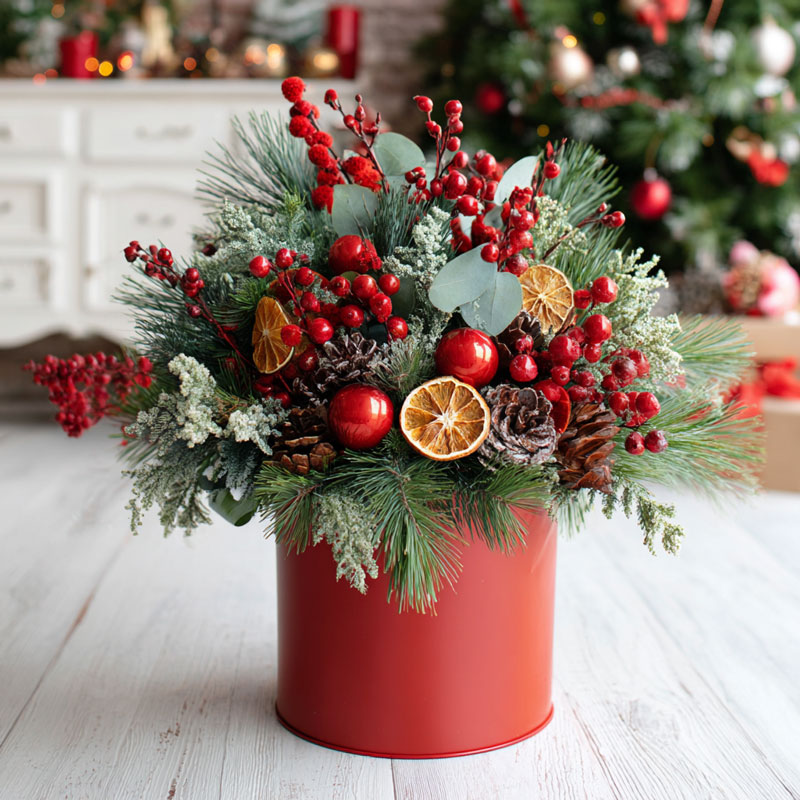 Festive Christmas Floral Centerpiece – Rustic Red & Green Holiday Charm